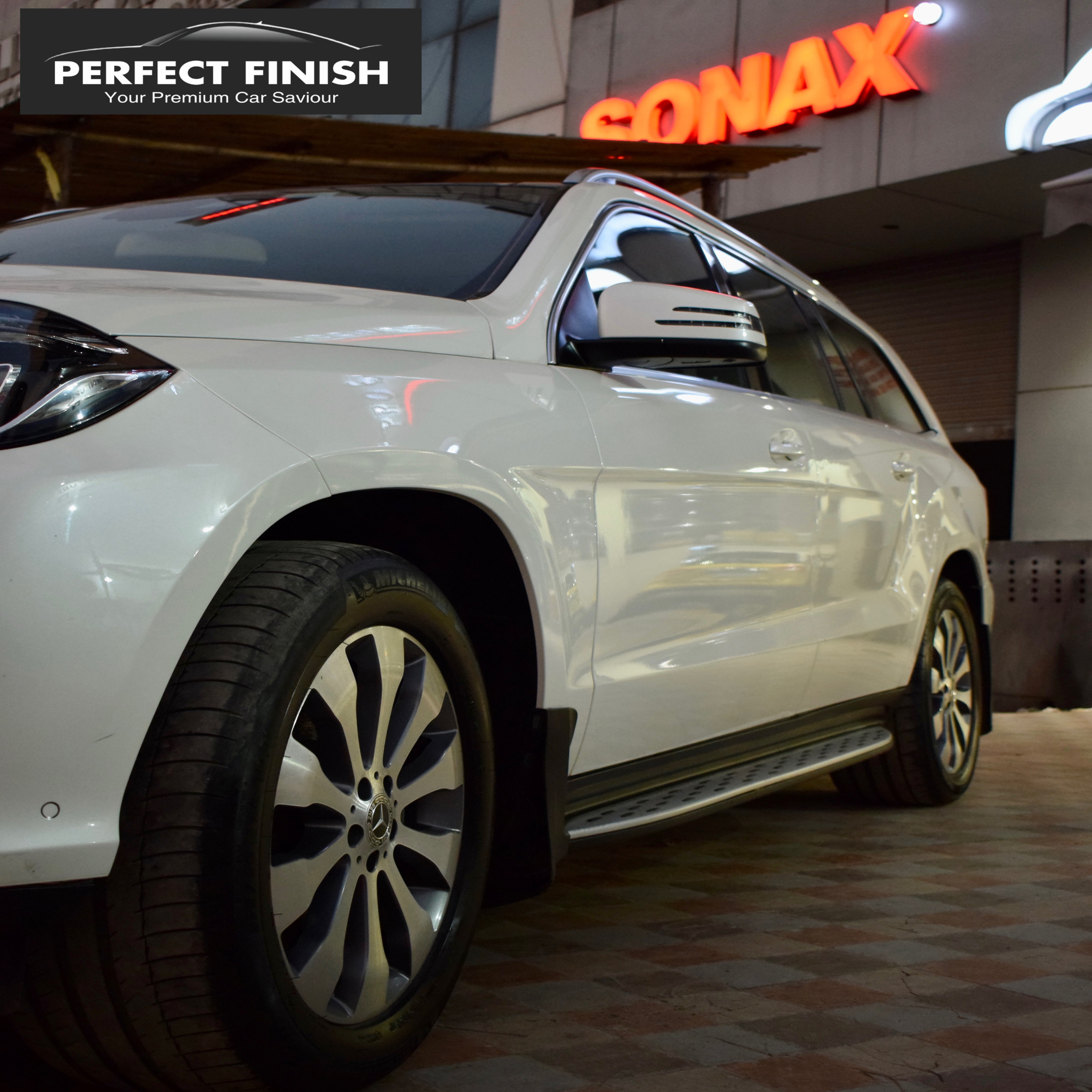 GARWARE PPF protection in FARIDABAD applied on " Mercedes Benz GLS 350d " at PERFECT FINISH. Paint protection film (PPF, also called clear film or clear paint film) is a thermoplastic urethane often self healing film applied on painted surfaces of a new or used car in order to protect the paint from stone chips, bug splatters, and minor abrasions.